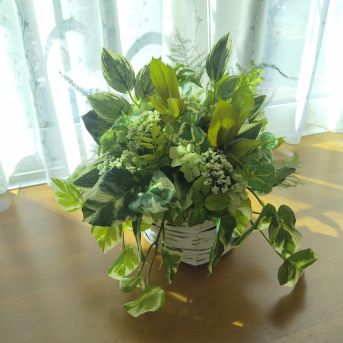 色んなグリーンを一つのカゴに詰め込んだプリザーブドリーフ入りのアレンジメント