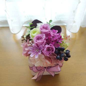 ミニバラが可愛い紫のプリザーブドフラワー(クリアケース入り)