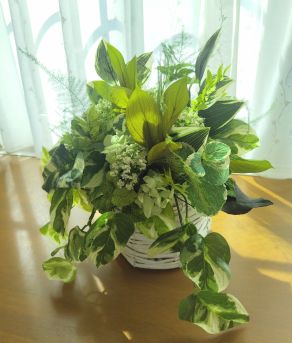 グリーンのデコレーションケーキのプリザーブドフラワー(クリアケース入り)